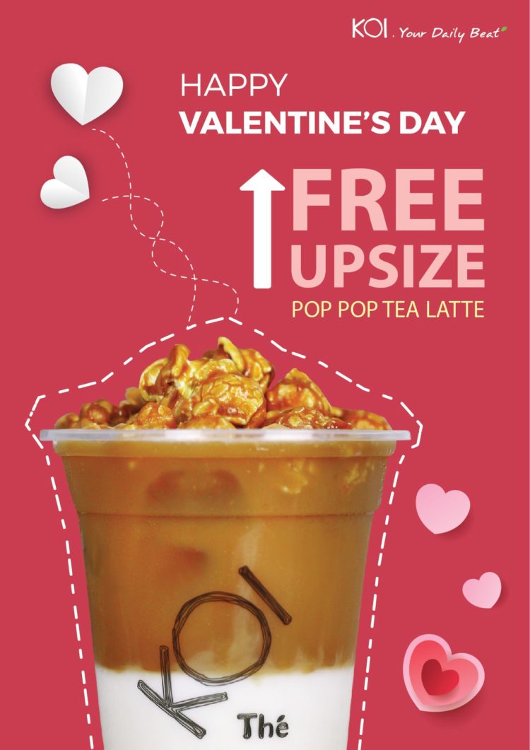 – Trong 02 ngày 13 – 14/02 hãng trà sữa KOI Thé free upsize các sản phẩm: Pop Pop Tea Latte và Pop Pop Black Tea/Green Tea Macchiato