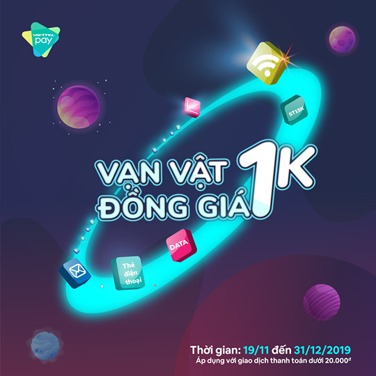 CHI TIẾT CHƯƠNG TRÌNH KHUYẾN MẠI Thời gian: 19/11 – 31/12/2019 Đối tượng tham gia: Khách hàng (KH) nằm trong danh sách được khuyến mại & nhận tin nhắn thông báo qua SMS của chương trình Chi tiết chương trình: Đồng giá 1.000đ tất cả các giao dịch thanh toán trên ViettelPay (áp dụng các…