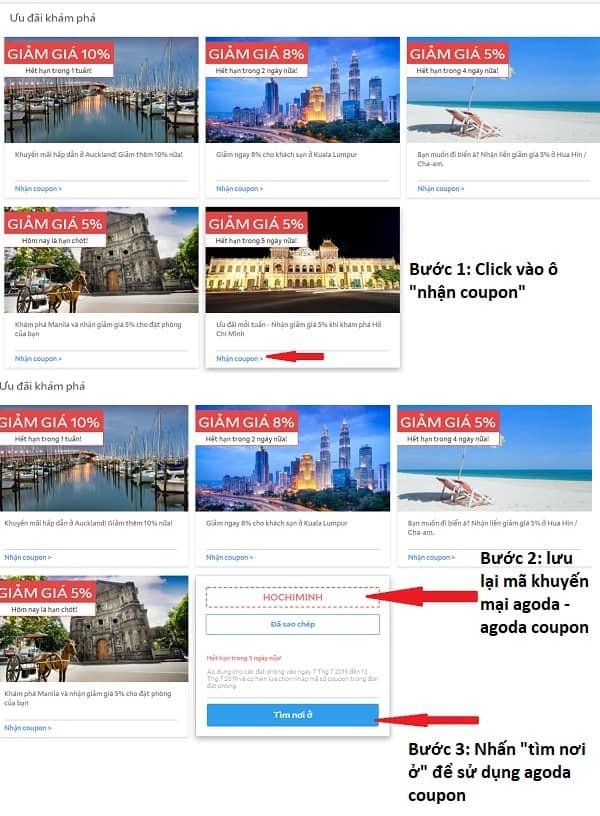 Trong ảnh bạn sẽ thấy những địa điểm đang có mã giảm giá Agoda với ưu đãi % cụ thể, nếu điểm đến của bạn nằm trong danh sách các địa điểm này thì bạn hãy click vào phần “ nhận coupon “. Sau khi bạn nhấn vào ô nhận coupon Agoda, bạn sẽ thấy mã coupon hiện ra và một số chú ý phía dưới như mã coupon hết hạn trong vòng bao lâu, mã coupon áp dụng cho những đơn đặt phòng trong thời gian nào.
