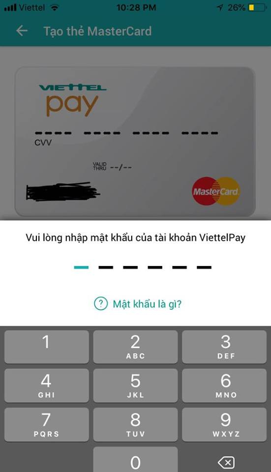 Tiếp đó, bạn hãy chọn “TẠO THẺ”. Sau đó, bạn hãy nhập mật khẩu của tài khoản Viettel Pay khi hệ thống yêu cầu như hình dưới.