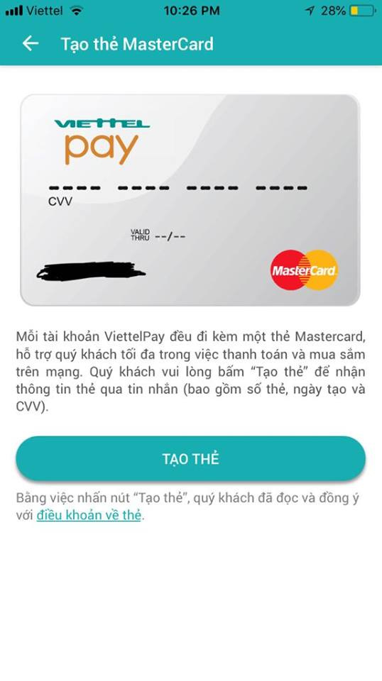 Thông thường, thông tin về thẻ sẽ được cung cấp qua 2 tin nhắn. 1 tin nhắn cung cấp 8 số đầu của thẻ, thời điểm hết hạn của thẻ và số CVV, 1 tin nhắn cung cấp 8 số cuối của thẻ. Thẻ Mastercard ảo này được phát hành bởi Ngân hàng Thương mại Cổ phần Quân đội MBank. Số dư tài khoản Viettel Pay của bạn cũng là số dư trong thẻ Mastercard ảo này để bạn sử dụng.