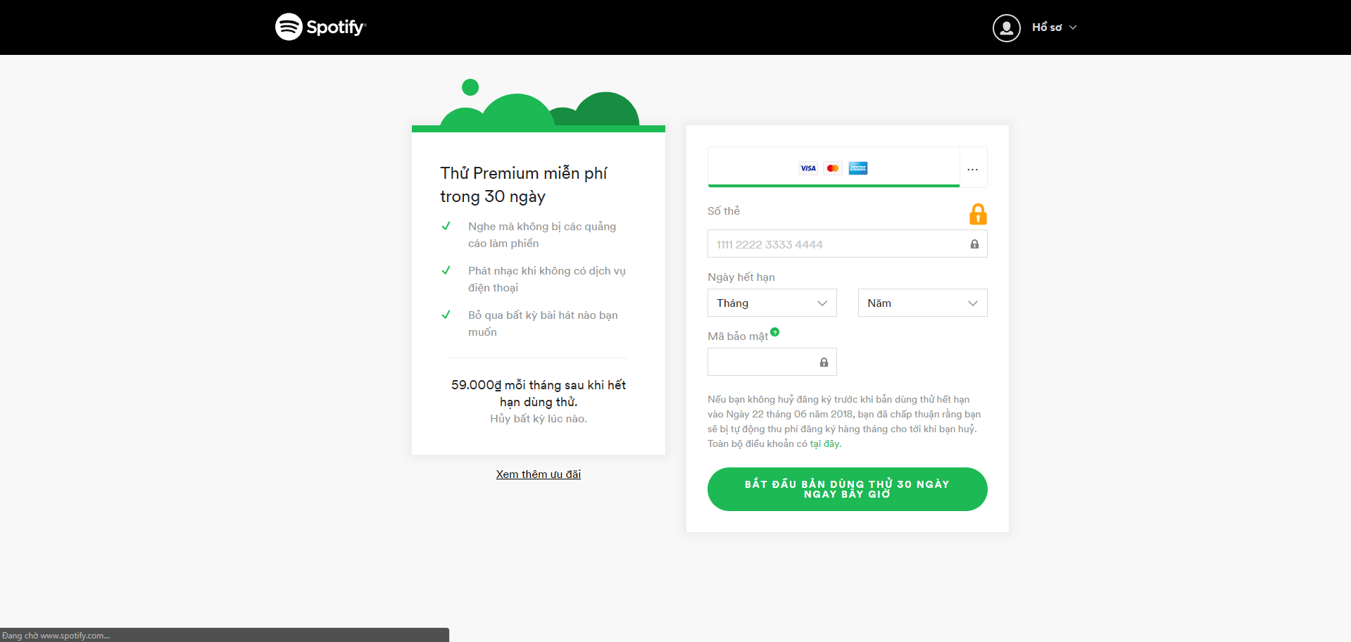 Hiện tại, mức phí đế sử dụng Spotify Premium là 59,000đ/tháng, và chỉ có thể thanh toán bằng thẻ VISA hoặc Mastercard. Tuy nhiên, Spotify cho bạn lựa chọn dùng thử để trải nghiệm các tính năng của Spotify Premium trong 30 ngày không mât phí. Vậy điều kiện là gì? Bạn cần cung cấp các thông tin cá nhân và thông tin thẻ VISA/Mastercard của bạn cho Spotify. Quá đơn giản. Nếu cảm thấy không hài lòng và không có nhu cầu sử dụng Spotify Premium sau thời gian dùng thử, bạn có thể hủy đăng ký và sẽ không mất xu nào.