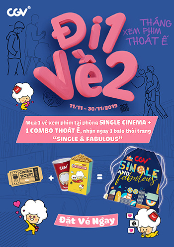 Khi mua 1 vé xem phim tại phòng SINGLE CINEMA kèm 1 COMBO THOÁT Ế, nhận ngay 1 balo thời trang SINGLE & FABULOUS. Đặt vé tại đây Điều kiện & điều khoản: Áp dụng cho các suất chiếu từ 11/11 – 30/11/2019 Chỉ áp dụng khi mua vé tại các phòng chiếu SINGLE CINEMA*…