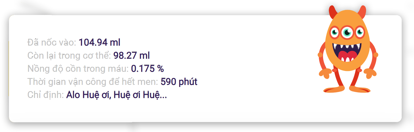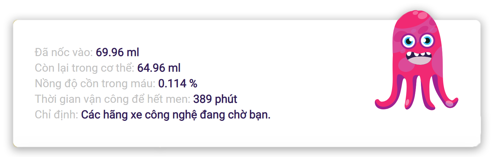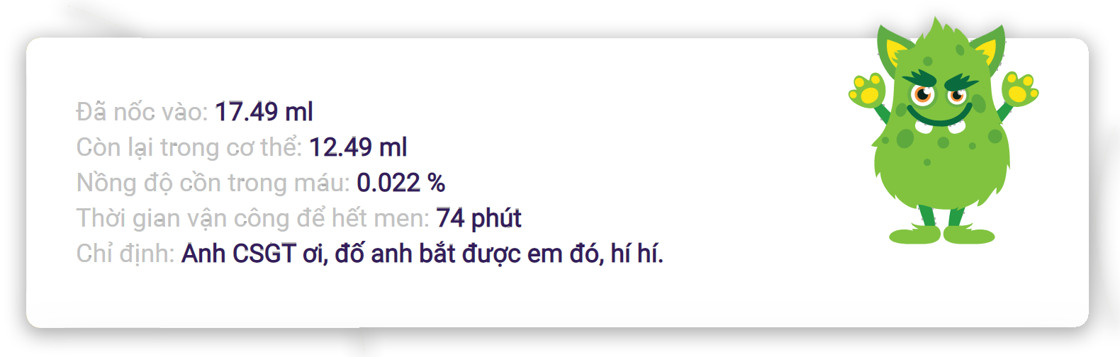 Sau khiên điền xog các thông số bạn nhấn vào “Đo” hệ thống sẽ trả về cho bạn: số ml bia rượu bạn đã uống, số còn lại trong cở thể, nồng độ cồn trong máu, thời gian để bia rượu tan đi, và lời khuyên bạn có nên tham gia giao thông tiếp hay không hay là nên nhờ người khác chở về.