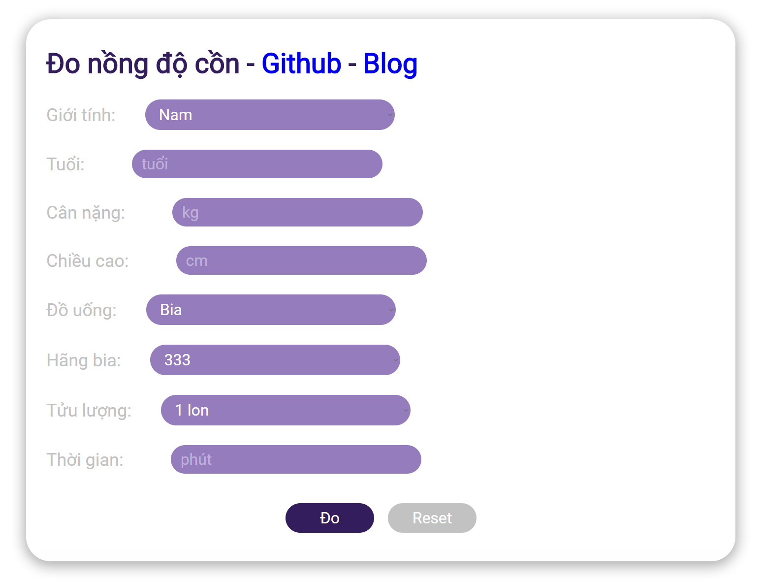 Đây là trang web lập ra với mục đích giúp bạn có thể tự kiểm tra nồng độ cồn của bản thân xem đã vượt qua giới hạn hay chưa. Bạn hãy nhập vào các thông tin cần thiết kể cho ra kết quả chính xác nhất như chiều cao, cân nặng, giới tính, loại bia rượu mà bạn uống, số lượng uống và thời gian uống,…