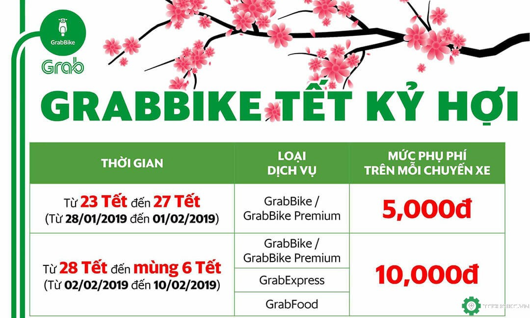 Dịp tết nhu cầu đi lại tăng cao cũng như lượng tài xế chạy xe ít hơn do phải về ăn tết nên giá cước Grab sẽ có sự thay đổi nhẹ cụ thể là tăng vào dịp tết để hỗ trợ cho tài xế lái xe tết, đây còn gọi là phụ phí tết, cụ thể cước phí các dịch vụ 2 bánh như: GrabBike, GrabExpress, GrabFood sẽ thay đổi như sau: