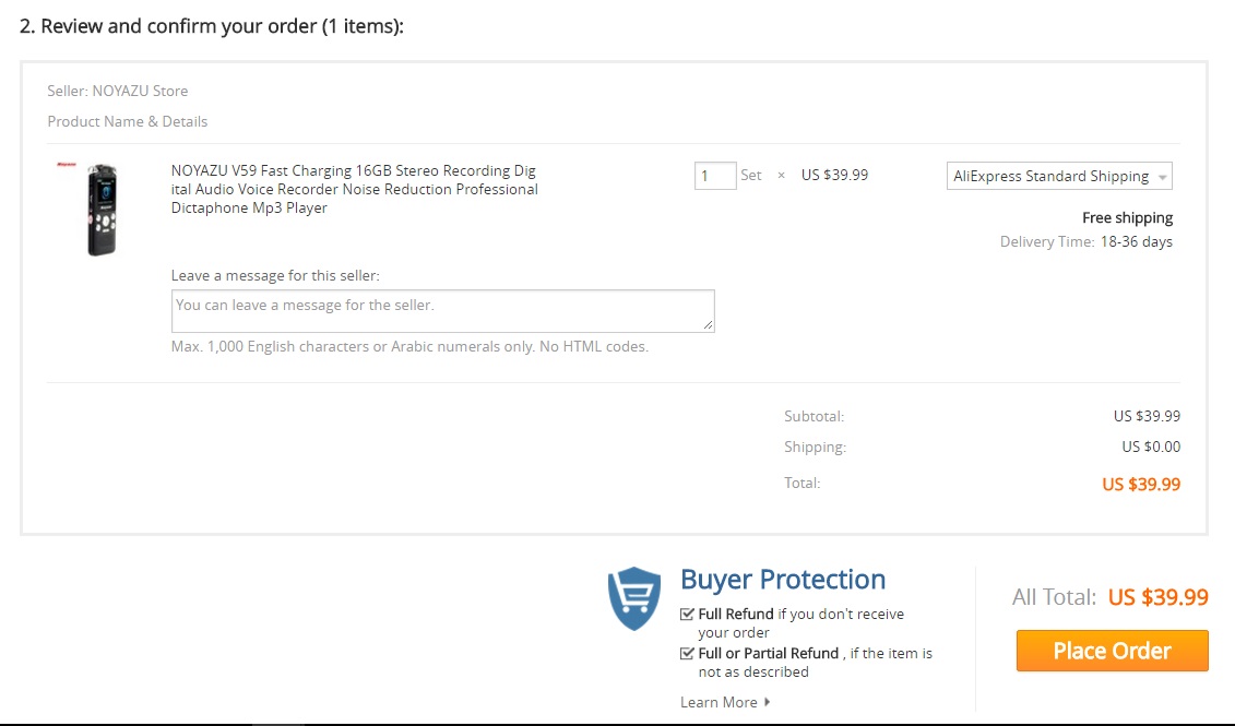 Bước thanh toán đầu tiên là Review your Order, tại bước này AliExpress sẽ yêu cầu bạn nhập thông tin địa chỉ chuyển hàng và confirm thông tin Order gồm thông tin các sản phẩm bạn muốn mua, bao gồm giá sản phẩm, giá ship, số lượng, cách thức ship hàng.