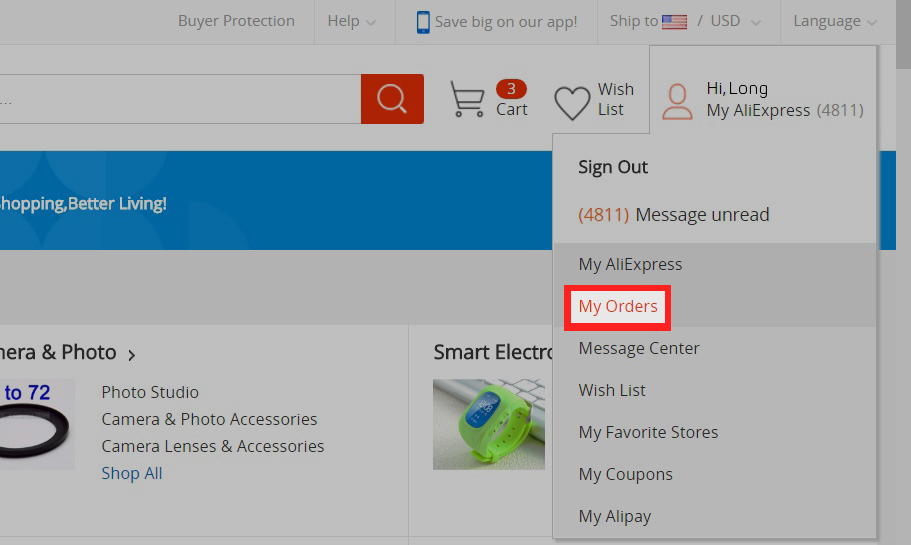 Nếu muốn kiểm tra lại đơn hàng, bạn cần đăng nhập vào tài khoản của mình rồi chọn “My Orders” trong menu cạnh tên tài khoản.