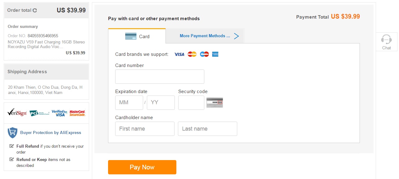 Sau khi nhấn “Place Order” bạn sẽ được chuyển đến trang thanh toán, hình thức thanh toán mà hầu hết seller trên AliExpress chấp nhận là thanh toán bằng thẻ thanh toán quốc tế.
