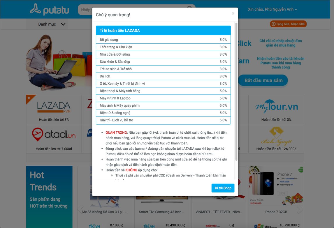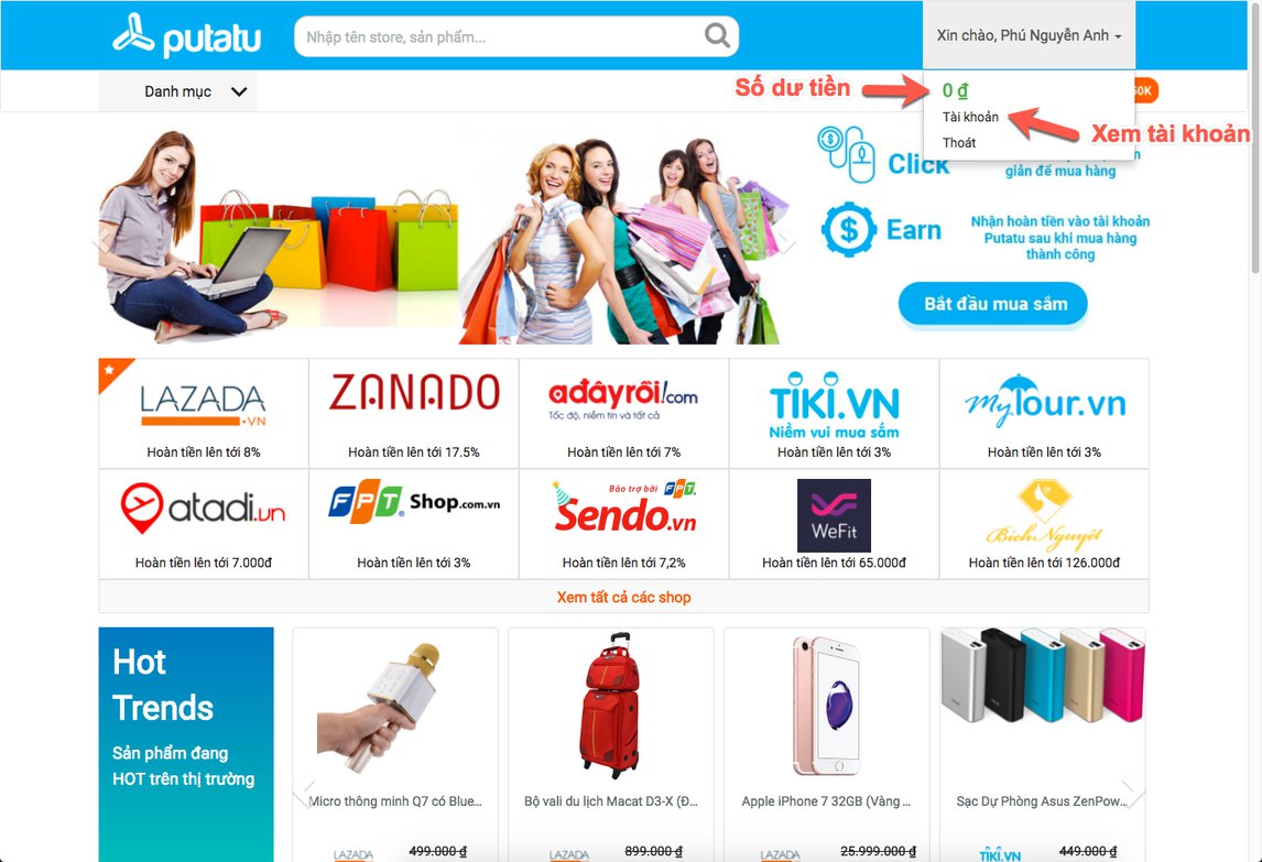 Sau khi đăng nhập, bạn đã có thể thoả thích mua sắm để nhận hoàn tiền từ Putatu.com .