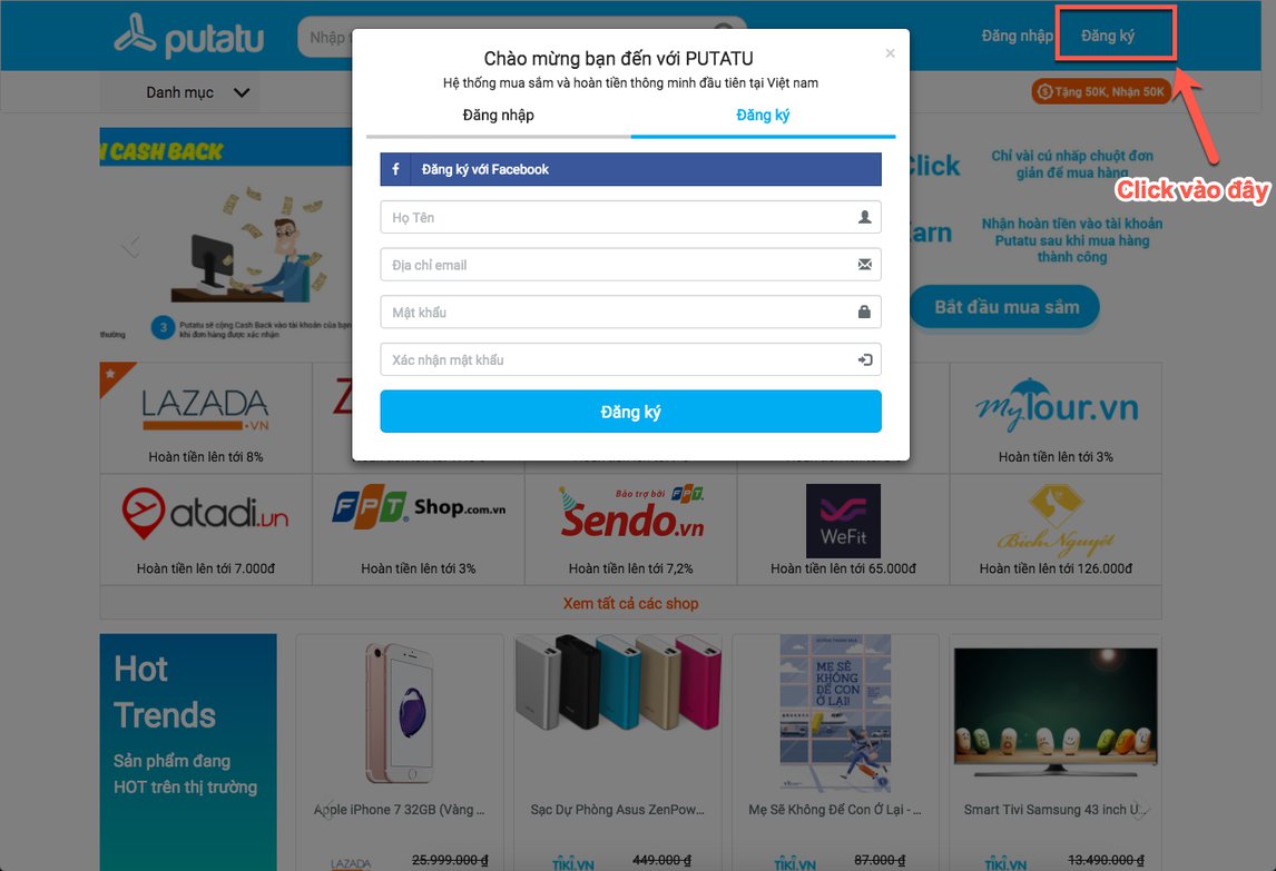 Bạn vào trang https://putatu.com, click vào nút “Đăng ký” sẽ hiện lên hộp thoại đăng ký tài khoản.