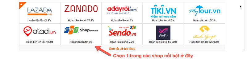 Có 3 cách lựa chọn đồ mình muốn mua như dưới đây (chi tiết bên dưới). Sau khi chọn 1 trong 3 cách này, bạn click vào thì sẽ hiển thị hộp thoại thông báo tỷ lệ % hoàn tiền theo category của các shop tương ứng với link bạn click vào.
