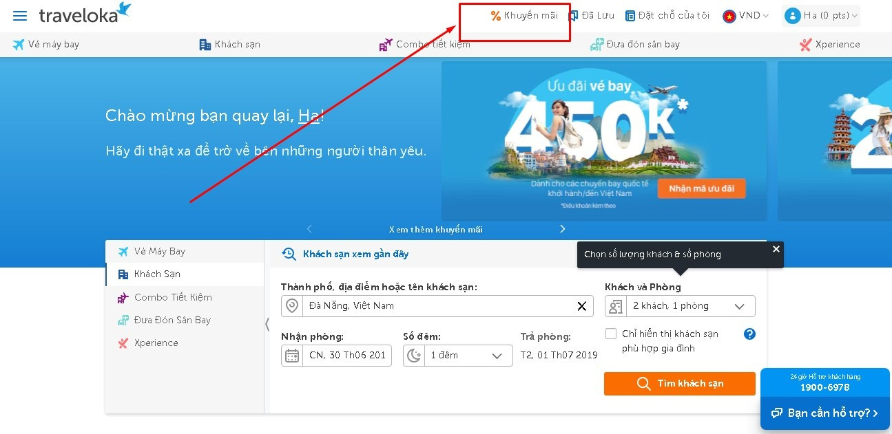- Tìm trong danh mục Khuyến Mãi : Ngay trong giao diện chính thức của Traveloka, bạn click vào mục Khuyến mãi trên thanh công cụ đầu tiên. Lúc này, giao diện hiện ra tất cả các mã giảm giá khuyến mãi hiện hành của Traveloka, bạn có thể tìm kiếm nhanh chóng hơn bằng cách tick vào các mục lựa chọn mã giảm giá cho vé máy bay, khách sạn, chủ thẻ tín dụng,…