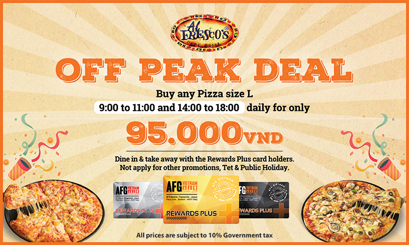 Trong khung giờ vàng từ 9:00 – 11:00 hoặc14:00 – 18:00 hàng ngày. Pizza size L giá chỉ còn 95.000 áp dụng trên toàn hệ thống dành cho các khách hàng sử dụng thẻ Rewards Plus của Al Presco’s