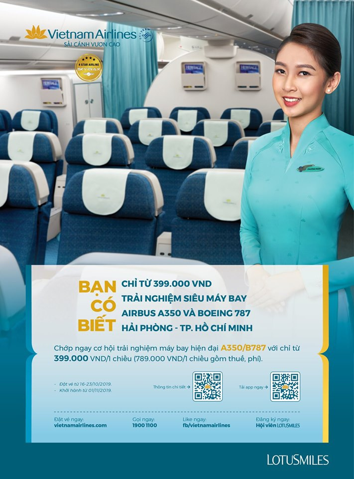 Từ ngày 27/10/2019, Vietnam Airlines lần đầu tiên đưa các “siêu máy bay” thân rộng Boeing 787 và Airbus A350 khai thác trên đường bay giữa TP.HCM – Hải Phòng vào các ngày từ thứ 2 đến thứ 6 và Chủ Nhật hàng tuần.