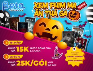 - Từ ngày 18 – 24/10 hệ thống Beta Cineplex áp dụng chương trình “Xem phim ma – ăn thả ga” đồng giá tất cả các sản phẩm nước đóng chai và snack chỉ 15k khi khách mua kèm Beta combo hoặc Sweet combo