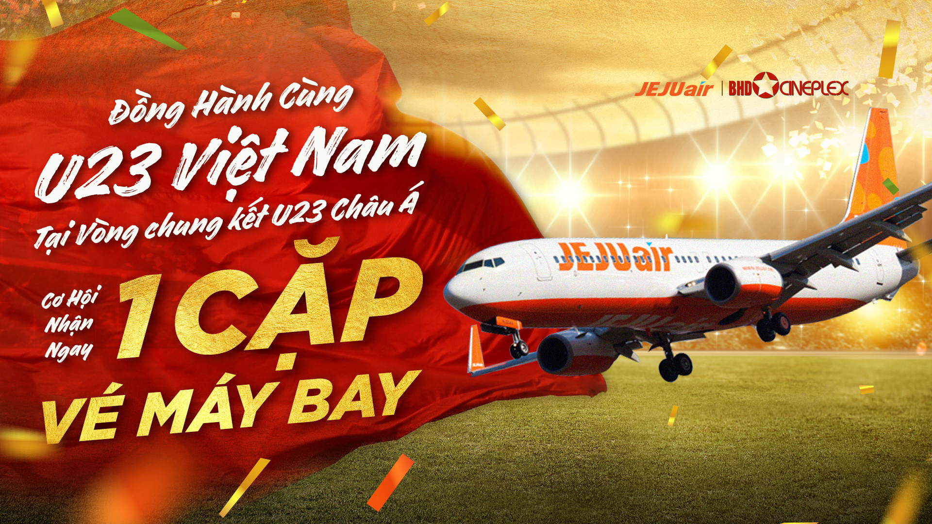 – Khi đến rạp BHD Star xem trực tiếp các trận bóng chung kết U23 Việt Nam kèm mua 1 COMBO U23, bạn sẽ nhận ngay 1 vé xem phim miễn phí và tham gia dự đoán tỉ số để có cơ hội trở thành chủ nhân của cặp vé quyền lực được tài trợ bởi hãng hàng không Jeju Air. Chi tiết