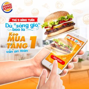 Vào thứ 5 hàng tuần, khi order tại Burger King trên các ứng dụng gọi đồ ăn GrabFood, GoFood, NOW, Baemin, các bạn sẽ nhận được ưu đãi: