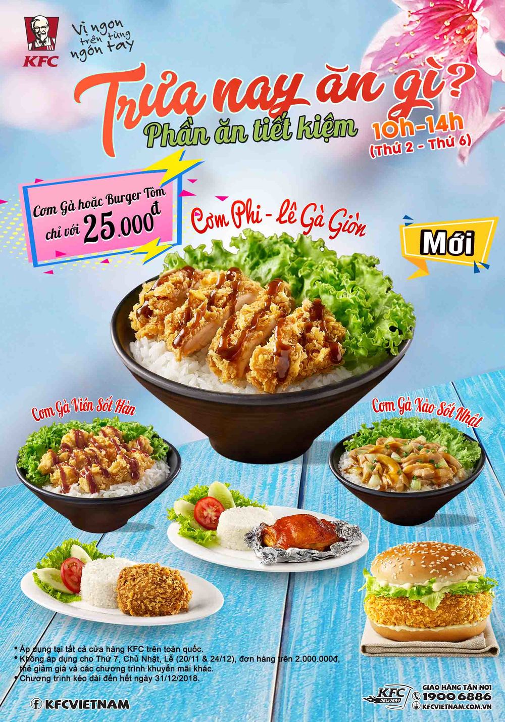 Phần ăn siêu tiết kiệm “Trưa nay ăn gì” version hoàn toàn mới đã trở lại quá hoành tráng. Bất kể bạn đang ở văn phòng hay ở đâu hãy ghé ngay các cửa hàng KFC hoặc gọi ngay Tổng đài Giao hàng tận nơi của KFC để thưởng thức những phần ăn bữa trưa thật ngon, thật tiết kiệm chỉ từ 25.000đ/phần (giá gốc 41.000đ).