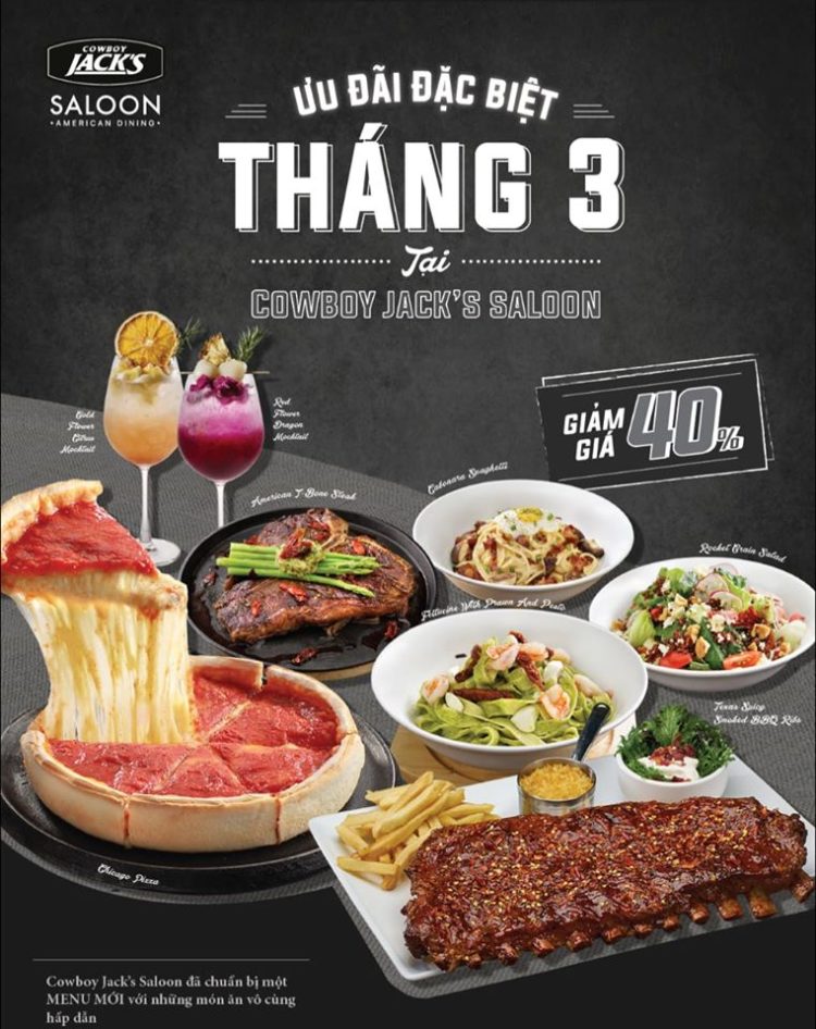 Cowboy Jack’s ưu đãi 40% toàn bộ các món trong thực đơn mới.