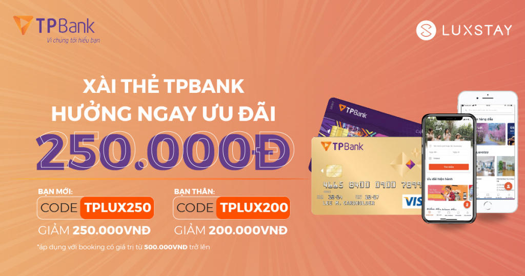 Từ ngày 15/9/2019 đến 31/12/2019, khi sử dụng thẻ TPBank đặt phòng trên nền tảng Luxstay, bạn sẽ nhận được ưu đãi lên tới 250.000VNĐ.