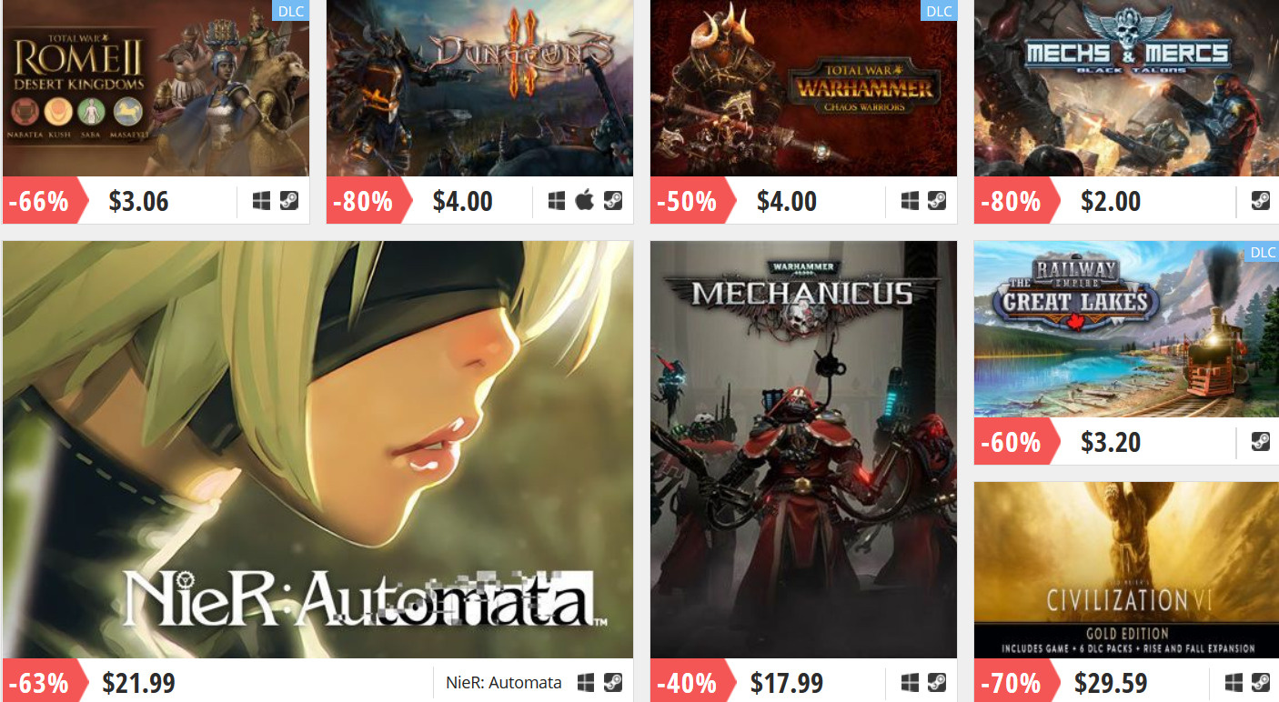 DLGamer hiện đang có chương trình giảm giá game cực mạnh bao gồm rất nhiều game hot, kéo dài từ nay cho tới ngày 28-08-2019. Có thể liệt kê một vài tựa game sáng giá trong chương trình này như: Nier: Automata (giảm 63% còn $21.99), Civ VI (giảm 75% còn $14.99) cùng với các DLC khác. Mình sẽ liệt kê ra một vài tựa game đáng chú ý được giảm nhiều trong chương trình này nhé