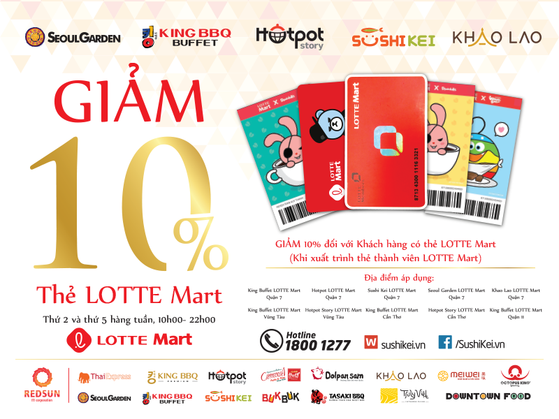 – Ưu đãi giảm 10% trên tổng hoá đơn (trước thuế) đối với các khách hàng có thẻ thành viên LOTTE Mart (thẻ cũ, thẻ mới và thẻ online theo mẫu đính kèm).