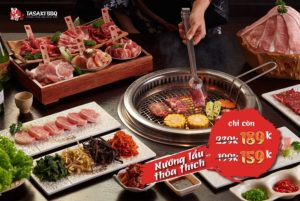 Chương trình Nướng Lẩu No Nê ăn thỏa thích ở Tasaki BBQ chỉ với giá 159k/người thay vì 199k – giá 189k/người thay vì 239k. Đừng quên thêm 20k để nhúng lẩu tưng bừng!