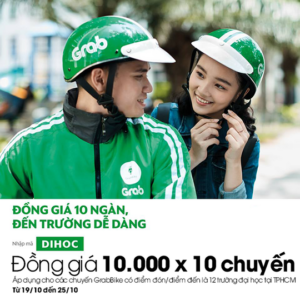 Nhập mã DIHOC, ưu đãi đồng giá 10k (tối đa 25k) x 10 chuyến GrabBike có điểm đến/ điểm đi tại 46 trường đại học.