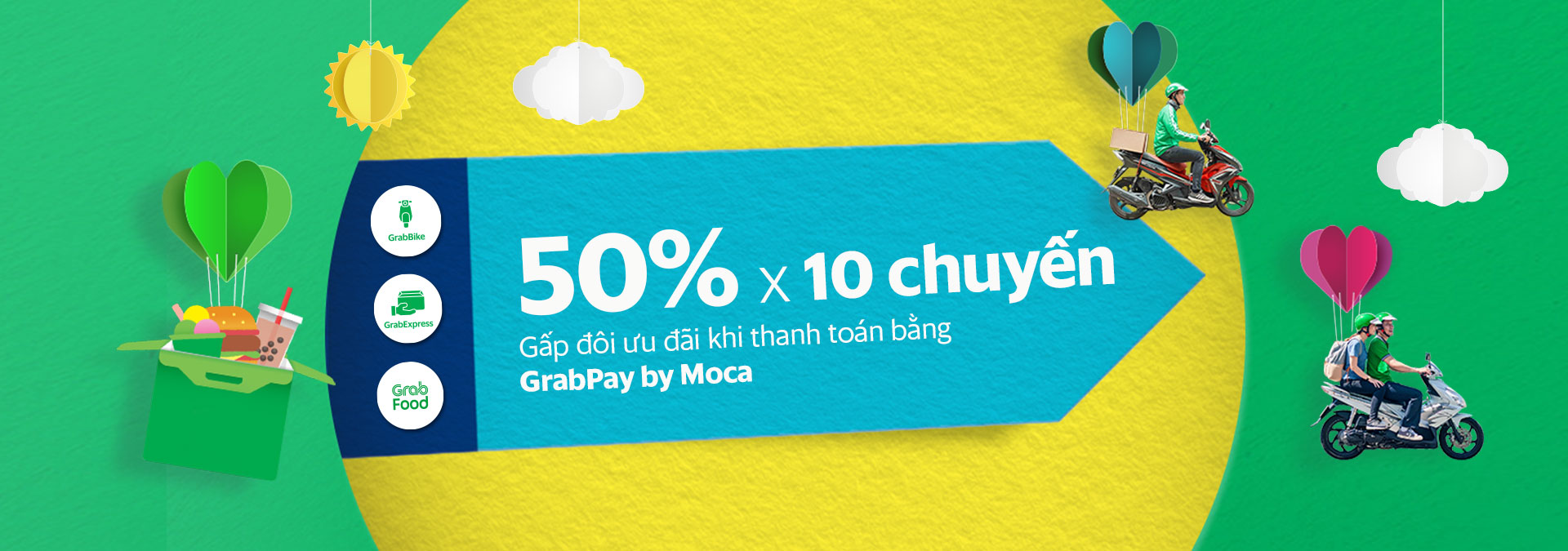 Nhập mã XANH để nhận ưu đãi 50% (tối đa 50.000đ) x 10 chuyến GrabBike, GrabExpress hoặc GrabFood.