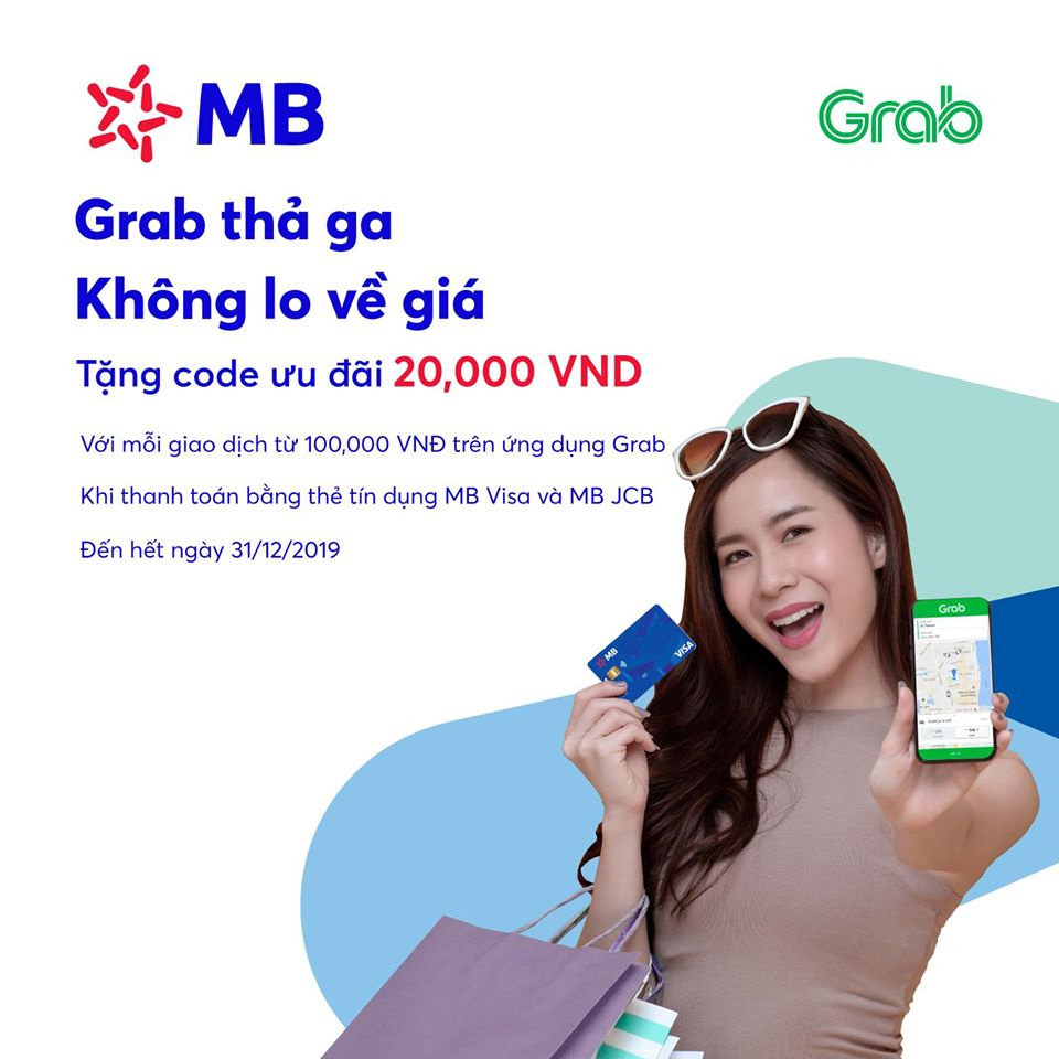 Đến hết 29/2/2020, với mỗi giao dịch thanh toán thành công từ 100.000 VNĐ trở lên trên ứng dụng Grab bằng thẻ tín dụng MB Visa hoặc MB JCB, chủ thẻ sẽ được 1 mã ưu đãi Grab trị giá 20.000 VNĐ đế sử dụng cho lần giao dịch kế tiếp.