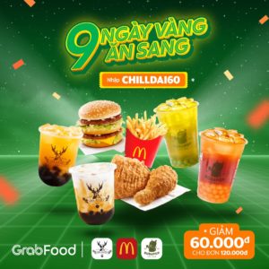 Nhập mã CHILLDAI60 khi đặt đồ ăn trên GrabFood nhận ngay ưu đãi giảm 60K cho đơn từ 120K.