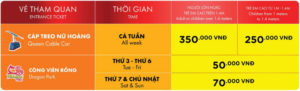 - Trong các dịp lễ giá vé sẽ được tính phụ thu thêm 50.000 Vnđ mỗi vẽ. Mức phụ thu sẽ được thông báo tại website, quầy vé và hotline