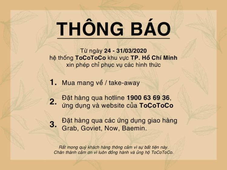 Theo chỉ đạo của UBND TP. HCM về phòng chống Covid-19, ToCoToCo chỉ phục vụ mua mang về và ưu đãi khi đặt hàng online