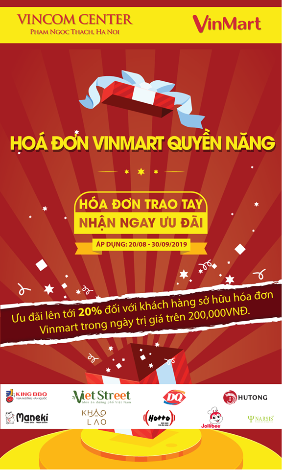 Vincom Phạm Ngọc Thạch có chương trình “Hóa đơn trao tay – Nhận ngay ưu đãi” lên tới 20% dối với khách hàng sở hữu hóa đơn Vinmart trong ngày giá trị trên 200.000 đồng.