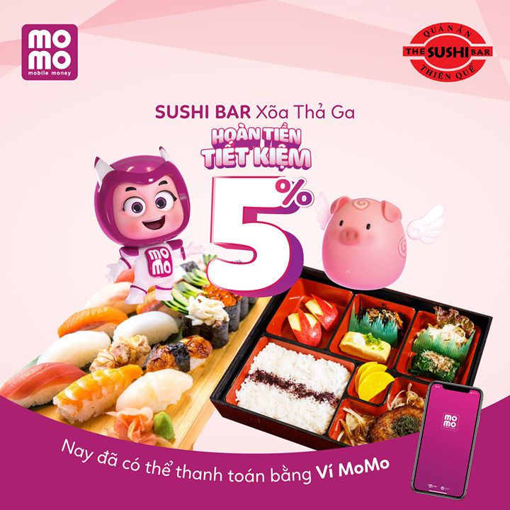 Hoàn ngay 5% hoá đơn khi thanh toán bằng ví điện tử Momo tại Sushi Bar. Sau khi thanh toán thành công, tiền sẽ được hoàn vào trong heo đất.