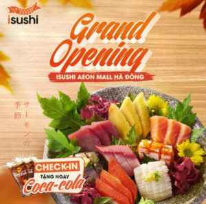 Nhân ngày khai trương cửa hàng ISushi tại AEON Mall Hà Đông ngày 14/12/2019 với nhiều suất buffet đồng giá, đấu giá và chương trình hấp dẫn khác. Cụ thể: