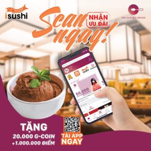 iSushi ưu đãi : với mỗi hóa đơn từ 100.000VNĐ trở lên, tải ứng dụng The Golden Spoon và chọn tích điểm thành công sẽ được nhận ngay một ly kem iSushi.
