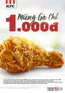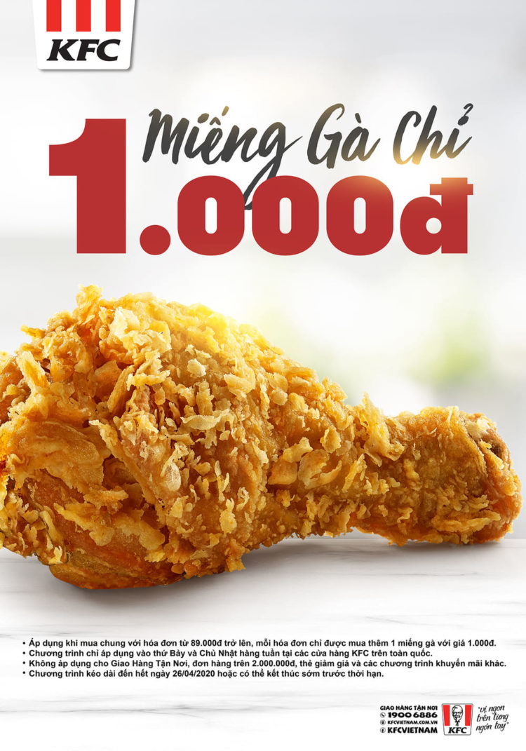 KFC khuyến mãi vào Thứ 7 và Chủ Nhật hàng tuần mua miếng gà chỉ 1K với hóa đơn từ 89.000 đồng