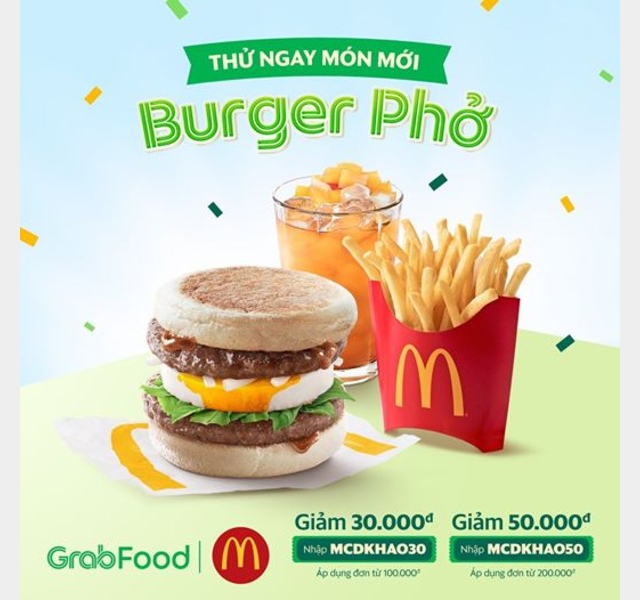 GrabFood cùng McDonald’s tặng bạn mã giảm giá giúp các bạn thưởng thức Burger Phở trứ danh tiết kiệm tại gia: