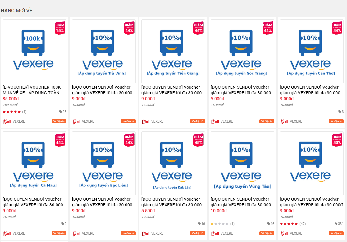 Vexere có mall chính thức trên Sendo, bán các voucher vé điện tử giảm giá cho nhiều chuyến xe khách đi các tỉnh. Bạn có thể mua để tiết kiệm hơn mỗi lần mua vé.