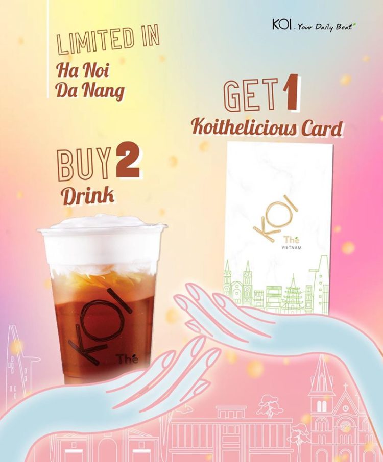 Khi mua từ 02 thức uống size bất kỳ tại KOI Thé, bạn sẽ được 01 thẻ thành viên với những quyền lợi: