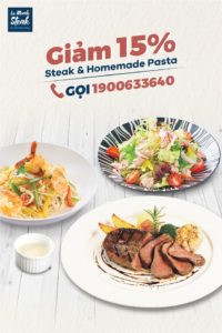 Le Monde Steak giảm 15% khi đặt món ăn lẻ trong danh mục Steak và Pasta giao hàng.