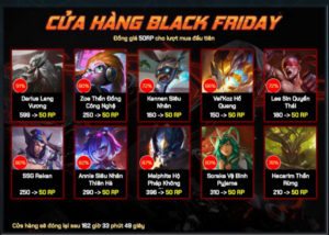 Trong sự kiện Black Friday này, từ 29/11 đến 5/12, hệ thống LOL sẽ đưa ra cho bạn tối đa 10 vật phẩm với mức giảm giá khác nhau. Đặc biệt hơn, trong lần mua đầu tiên, bạn chỉ cần bỏ ra 50 RP thôi. Chỉ 50 RP là có thể sở hữu một trang phục Huyền Thoại.