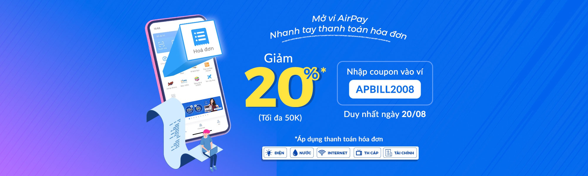 Duy nhất ngày 20.08. 2019 nhập coupon APBILL2008 vào ví AirPay