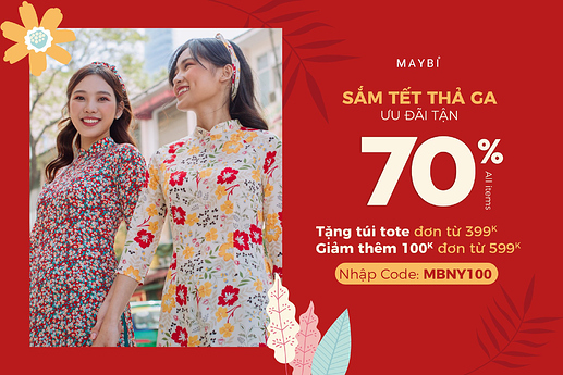 – Maybi giảm giá tới 70% toàn bộ sản phẩm thời trang nữ, đặc biệt váy và áo dài đón Tết 2020. Miễn phí ship cho hóa đơn trên 300K nội thành và trên 500K ngoại thành.