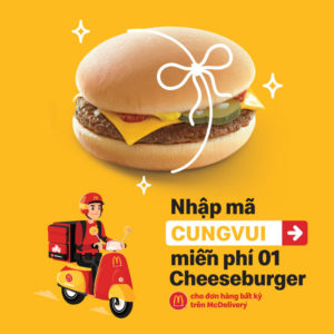 Nhập mã CUNGVUI, fan McDonald’s sẽ được tặng 1 bánh burger Cheeseburger cho đơn hàng bất kỳ khi đặt hàng trên ứng dụng giao hàng McDelivery