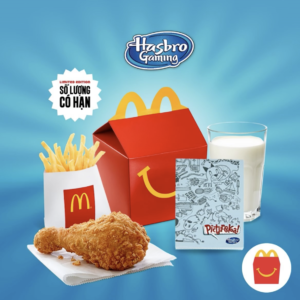 Khi gọi suất ăn cho trẻ em Happy Meal giá 65,000đ (bao gồm: một món chính (burger hoặc gà rán), một khoai tây chiên, một phần nước uống (sữa hoặc nước ngọt) và một đồ chơi hoặc sách truyện tặng kèm) sẽ được tặng một món đồ chơi ngẫu nhiên.