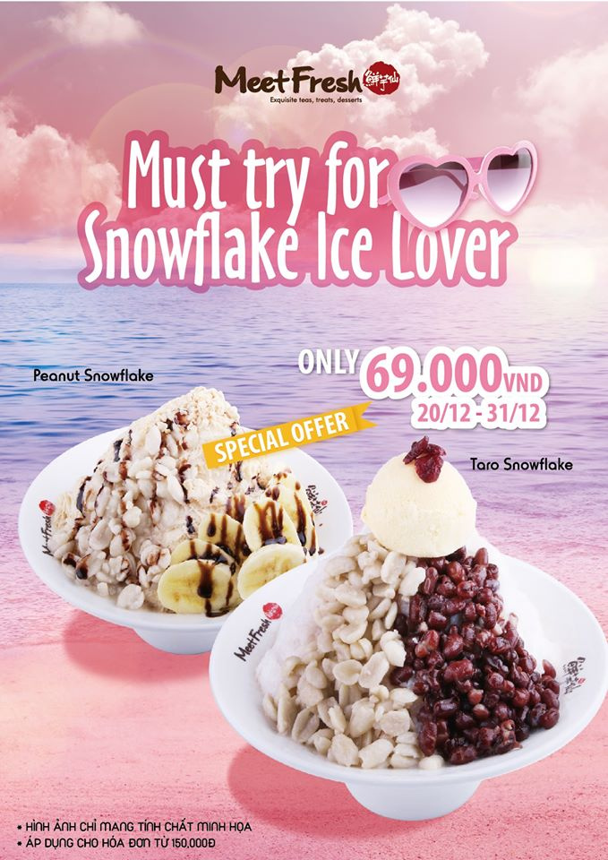 – Meet Fresh ưu đãi 2 món Kem tuyết vị đậu phộng và Kem tuyết vị khoai môn, còn 69K (Sản phẩm kem tuyết khác có giá từ 95K-105K)