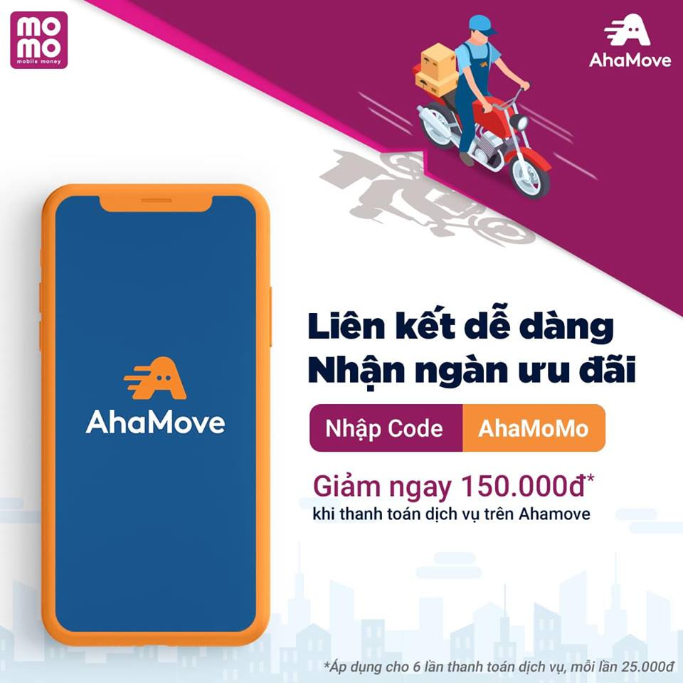 Để được nhận ưu đãi, bạn cần kích hoạt tài khoản Ví MoMo nhập mã “AHAMOMO” và liên kết ngân hàng, nạp 10k vào Ví, nhận ngay bộ voucher AhaMove với tổng giá trị 150.000đ bao gồm 6 voucher Ahamove cho 6 chuyến giao hàng, mỗi voucher trị giá 25.000đ.